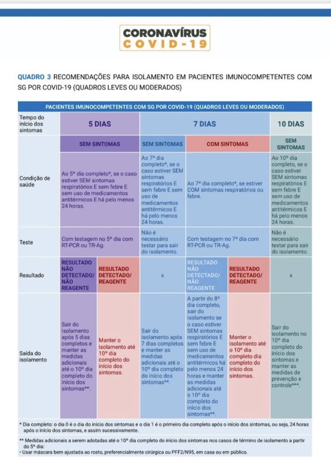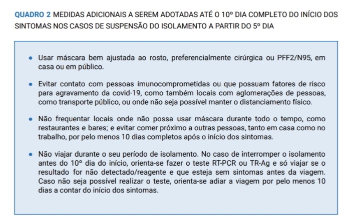 O Ministério da Saúde orienta que caso a pessoa que adquiriu a doença esteja assintomática há 24h, sem febre e sem uso de medicações e que teste negativa por RT-PCR ou Teste de Antígenos no 5º dia do quadro (sendo o dia 1 o primeiro dia dos sintomas), ela poderá sair do isolamento social. Respeitando as medidas do Quadro 2 abaixo.