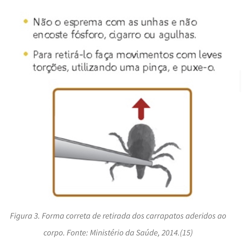 - Utilize sempre uma pinça para remover todo o carrapato. Não o aperte ou o esprema, pois isto confere uma maior chance de transmissão de doenças