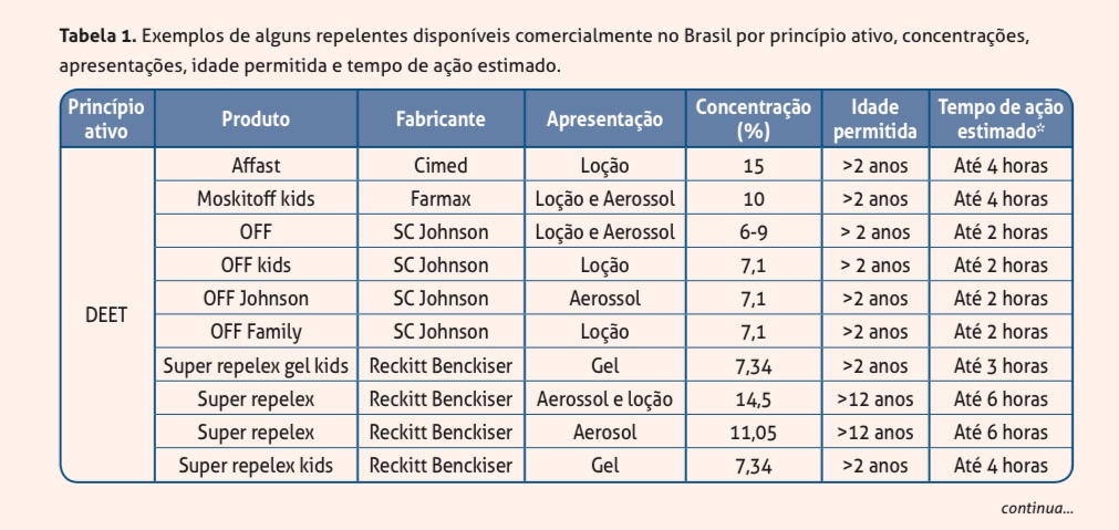 Os repelentes de DEET são os mais utilizados e mais “antigos”. Exemplos: OFF e Repelex.