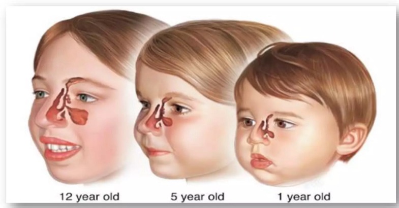 As crianças não nascem com todos os seios da face abertos. Eles vão se abrindo ao longo dos anos e terminam a sua pneumatização (abertura) no final da adolescência.